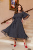 Рокля с разкроен силует и елегантни мрежести детайли в долната част на ръкавите и горната част на модела. Ръкавите са с 3/4 дължина с волани за допълнителен ефект. Включва колан, който подчертава талията. Подходяща за официални и специални поводи.