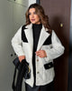 Short two-tone karakul coat with accent pockets and a belt to highlight the waist. An elegant and modern design that adds a stylish finishing touch to any outfit.