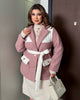 Short two-tone karakul coat with accent pockets and a belt to highlight the waist. An elegant and modern design that adds a stylish finishing touch to any outfit.