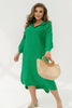Linen dress with a hood. A modern and stylish midi-length dress with dropped shoulders, featuring a loose, oversized fit and long sleeves. The small V-neckline transitions into the hood, and a large functional front pocket adds practicality. The back hem is slightly longer for a contemporary look. Shown in size 2XL–3XL.