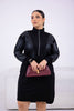Dress with a slightly relaxed and distinctive cut, featuring vertical leather inserts that elongate the silhouette and create a more elegant figure. The vertical zipper adds a stylish accent and visually lengthens the look. The model has a high collar and a length below the knee – a refined and modern choice for various occasions.