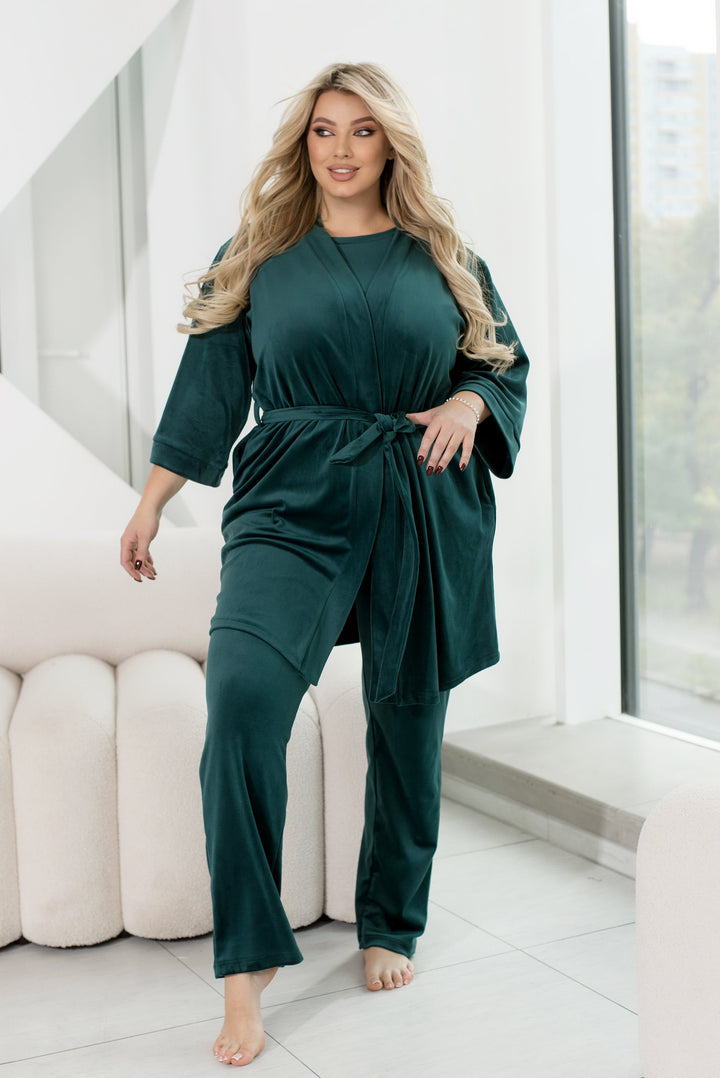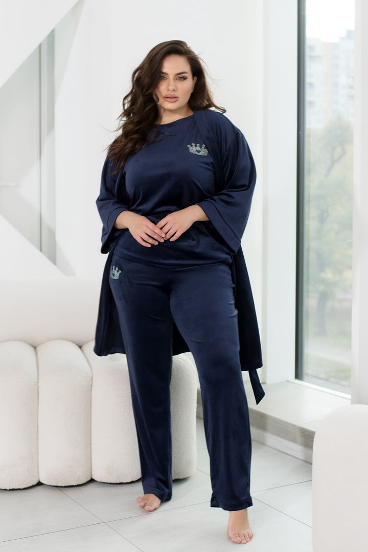 Stylish and comfortable three-piece set in plus sizes. The robe features side pockets, a stone-embellished back, a belt closure, and loops on both sides for added detail. The T-shirt is pull-on with no pockets, decorated with a stone print on the front, a round neckline, and soft-cuffed sleeves. The pants have a high waist with an elastic band and side pockets, offering both comfort and elegance – a perfect choice for any woman.