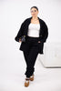 Dvoudílná sametová souprava. Vrchní část tvoří košile na knoflíky, kterou lze nosit samostatně nebo jako lehkou svrchní vrstvu, zatímco kalhoty mají elastický pas a manžety na lemu pro větší pohodlí.
