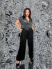 Elegantní černý overal s flitry na sametu – perfektní volba pro večerní příležitosti a slavnostní příležitosti. Spojuje styl a pohodlí, zdůrazňuje siluetu pružnou látkou pro perfektní střih. Široké nohavice dodávají eleganci a součástí je pásek, který dotváří vzhled s rafinovaným vzhledem.