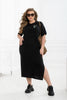 Midi šaty s řetízkem. Základní tričkové šaty s rovným střihem, kulatým výstřihem a krátkými rukávy s manžetami. Šaty zdobí nápisový design a kamínky. Volný střih a základní barvy vytvářejí minimalistický a pohodlný styl. Pásek není součástí sady. Modelka má na sobě velikost 2.