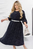 Midi šaty s třpytivým efektem – elegantní rovnováha mezi elegancí a každodenním pohodlím. Kulatý výstřih, definovaný pas a jemné plisované detaily vytvářejí ženskou siluetu, zatímco tříčtvrteční rukávy s mírným objemem na zápěstí dodávají šatům kouzlo. Součástí je pásek, který zdůrazňuje pas a jemný třpyt látky dodává slavnostní nádech i každodennímu nošení.