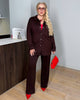 Moderní dvoudílná souprava z látky s jasnými kamínky – skutečný hit sezóny. Kalhoty mají rovný střih, zatímco bunda se vyznačuje výraznými ozdobnými knoflíky na zadní straně, které dodávají vzhledu moderní a nezapomenutelný akcent.