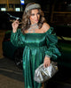 Krátké rozšířené šaty s dlouhým rukávem, které lze díky elastickému výstřihu nosit s odhalenými i zakrytými rameny. Guma v pase zdůrazňuje siluetu, zatímco látka krásně odráží světlo a dodává vzhledu jiskru a eleganci.