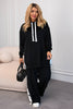 Stylová dámská sportovní souprava ze sametu s volným střihem. Mikina s kapucí má dlouhé rukávy a bílé stahovací šňůrky pro kontrastní akcent, zatímco kalhoty jsou široké s bílými pruhy a ozdobnými knoflíky po stranách. Souprava v sobě spojuje útulnost, moderní vzhled a ženskost díky měkké látce a jemným detailům.