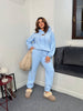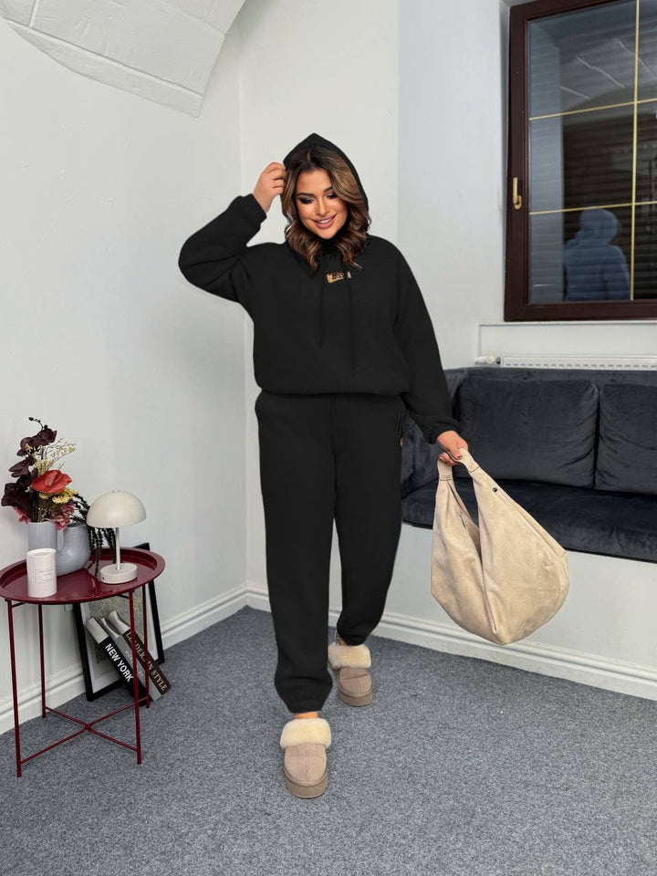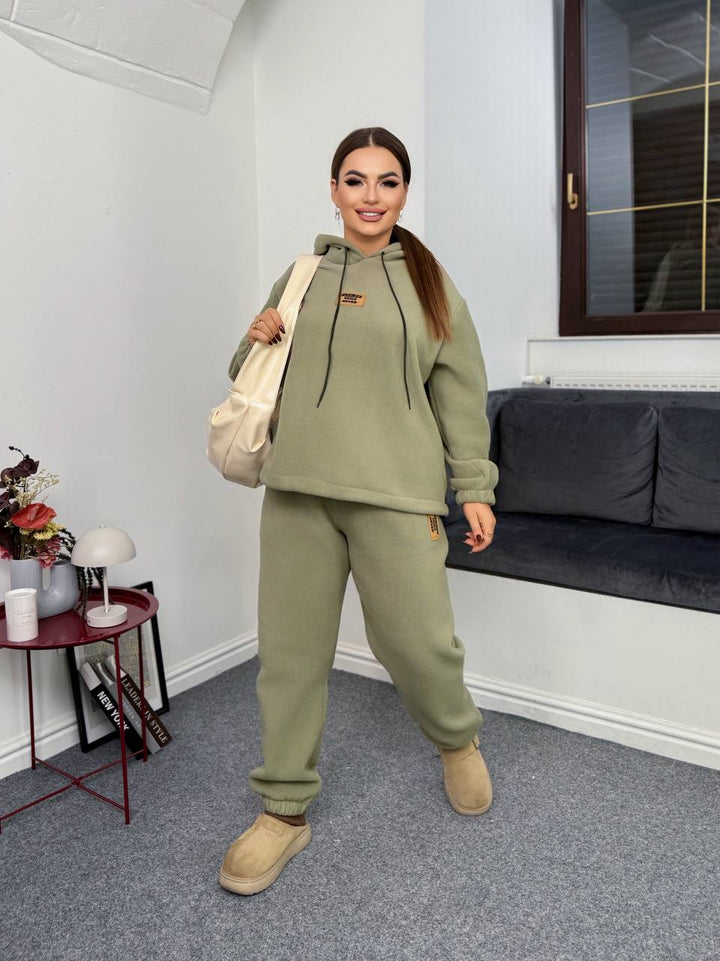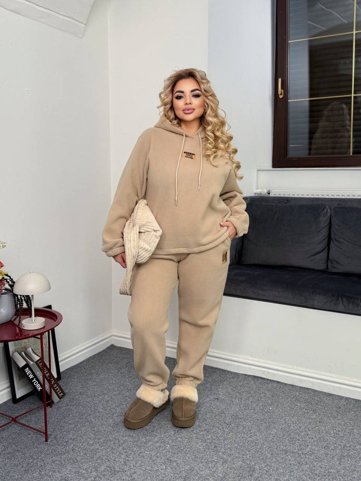 Stylisches Oversize-Sportset für Spaziergänge. Das Sweatshirt hat verstellbare Bänder am Saum und kann so lang oder hochgekrempelt getragen werden. Es ist aus wendbarem Fleece gefertigt, das auch nach dem Waschen seine Qualität behält – es knittert und fusselt nicht und bleibt außergewöhnlich warm und bequem. Die perfekte Wahl für jeden Tag.