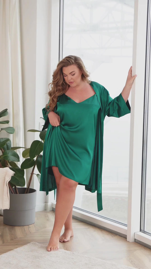 Σετ ρόμπας και νυχτικιού – ένας συνδυασμός απαλότητας, άνεσης και κομψότητας. Το νυχτικιού διαθέτει εκλεπτυσμένο κόψιμο που κολακεύει τη σιλουέτα, με λεπτές ρυθμιζόμενες τιράντες και λεπτομέρειες με κοψίματα στο στήθος για τέλεια εφαρμογή. Η ρόμπα έχει χαλαρή εφαρμογή που καλύπτει απαλά το σώμα, δημιουργώντας μια αίσθηση ελαφρότητας. Κατασκευασμένη από πολυτελές, αναπνεύσιμο και απαλό στην αφή μετάξι με διακριτική λάμψη, προσφέρει άνεση και κομψότητα. Μια ιδανική επιλογή για όσους εκτιμούν το εκλεπτυσμένο στυλ και την άνεση. Το μοντέλο φοράει μέγεθος 4.