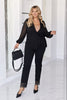 Σετ με πέτρες στα μανίκια – το κοστούμι είναι φτιαγμένο από διαγώνιο κρεπ με ελαφριά μανίκια από σιφόν. Τα μανίκια είναι διακοσμημένα με πέτρες υψηλής ποιότητας για μια εκλεπτυσμένη πινελιά. Το πάνω μέρος διαθέτει σχέδιο σε στυλ wrap με ζώνη που αναδεικνύει τη μέση και δημιουργεί μια θηλυκή σιλουέτα. Το παντελόνι έχει κωνικό σχήμα, με ζώνη μπροστά και ελαστική ζώνη στο πίσω μέρος. Το στρίφωμα του παντελονιού έχει λεπτομέρεια κομμένη με λέιζερ για ένα ντελικάτο αποτέλεσμα.