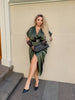 Elegantna haljina asimetrične duljine i upečatljivog dizajna s omotom sprijeda, izrađena od tkanine nalik satenu s decentnim sjajem. Ima kratke kimono rukave, V-izrez i definiran struk sa širokim sjajnim pojasom koji naglašava siluetu. Pogodna za formalne događaje i večernje izlaske.
