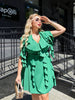 Kratka haljina s volanima, duljine 51 cm od struka i kopčanjem na omotanu podlogu. Model ima odličan kroj i zvonastu suknju koja ne dodaje volumen. Izrađena je od lagane i ugodne tkanine na dodir. Dekorativni volani dodaju prozračan osjećaj i upotpunjuju cjelokupni stil dizajna.