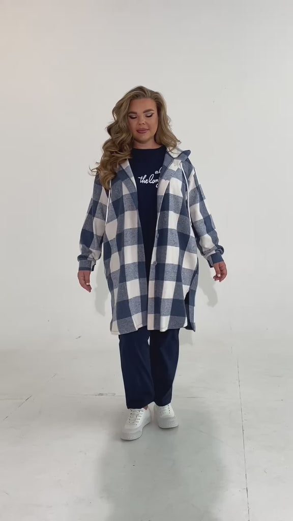 A nadrág középmagas derekú, rugalmas derékkal és oldalsó zsebekkel rendelkezik a mindennapi praktikum érdekében. A hosszú ujjú, ejtett vállú és kerek nyakkivágású felső elegáns sziluettet kölcsönöz, míg az enyhén megnyújtott hát modern hatást kölcsönöz. A szettet a kapucnis, húzózsinóros és zsebes mellény teszi teljessé, amely a funkcionalitást a sokoldalúsággal ötvözi, így könnyen kombinálható különböző öltözékekkel.