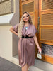 Elegáns, aszimmetrikus hosszúságú és feltűnő, elölről lefelé ívelt ruha, szaténszerű anyagból, finoman csillogó színben. Rövid kimonó ujjakkal, V-nyakkal és határozott derékkal, széles, fényes övvel, amely kiemeli a sziluettet. Formális eseményekre és esti kiruccanásokra egyaránt alkalmas.