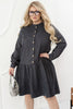 Puha bársony anyagból készült, ez a nőies ruha stílusos, modern és elegáns megjelenést kölcsönöz. Állógallérral, hosszú, mandzsettás ujjakkal és légies, játékos fodros díszítéssel rendelkezik. A ruha elöl középen gombsorral záródik.
