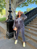 Elegante tuta in velluto con eleganti cuciture decorative, perfetta per l'uso quotidiano e il tempo libero. La felpa con cappuccio è dotata di cerniera e cappuccio per il massimo comfort. I pantaloni jogger a vita alta, con tasche laterali ed elastico in vita e sull'orlo, garantiscono un look perfetto.
