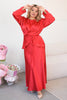 Blusa morbida con maniche lunghe e taglio asimmetrico, con cintura sottile da annodare per evidenziare il punto vita. Abbinata a una gonna midi in raso dalla silhouette morbida, crea un look elegante e femminile, perfetto per occasioni speciali o uscite serali.