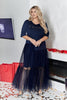 L'abito è realizzato in maglia di alta qualità con tulle leggero sulla parte superiore, creando un volume moderno e una delicata lucentezza. La scritta scintillante "Dream" aggiunge un tocco glamour, mentre la silhouette ampia con maniche al gomito e scollo rotondo garantisce comfort e stile.
