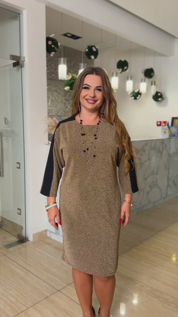 Stijlvolle damesjurk van hoogwaardige stof. Recht model, zonder voering en vleermuismouwen. Geschikt voor zowel formele gelegenheden als zakelijke bijeenkomsten – comfortabel, praktisch en elegant en verfijnd.