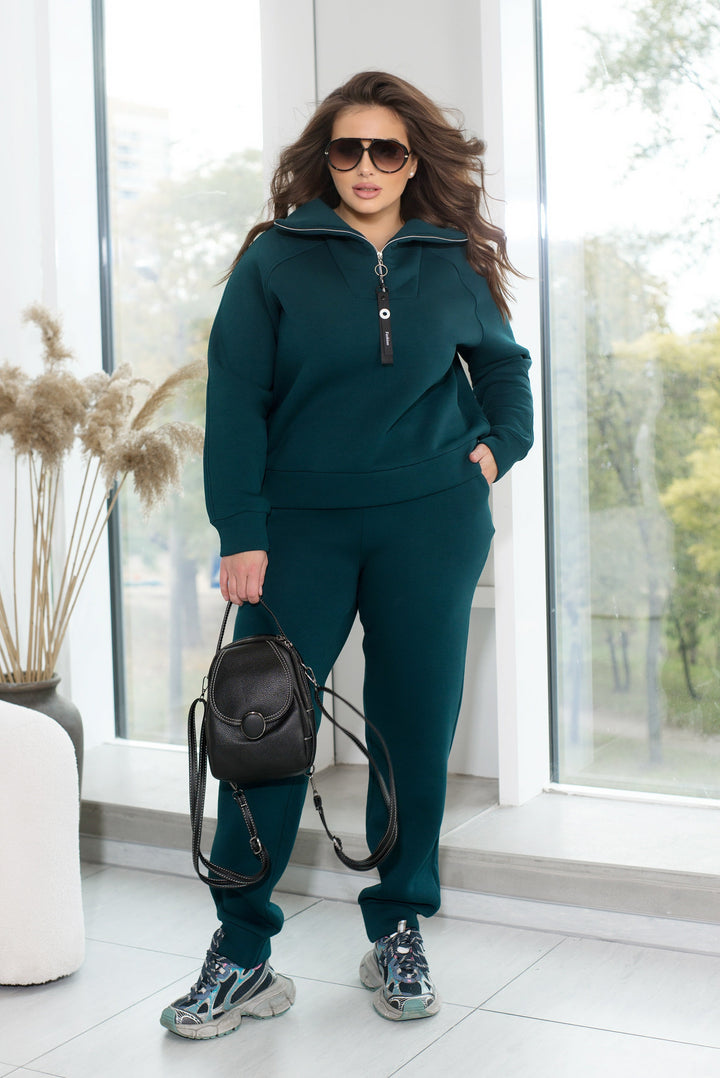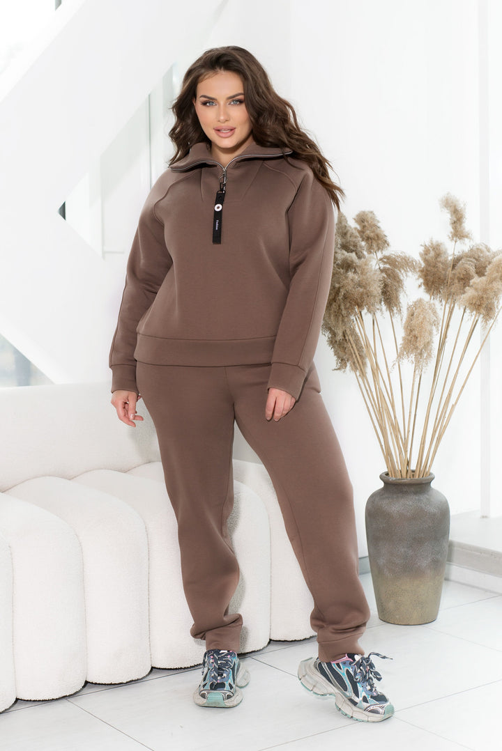 Gewatteerd breiwerkpak – warm, zacht en comfortabel. De sweater heeft een capuchon, terwijl de broek een wijde snit heeft en een elastische tailleband voor comfort en bewegingsvrijheid.