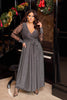 Elegancka, długa sukienka z błyszczącego lureksu z kopertowym dekoltem, który tworzy wyrafinowaną sylwetkę. Długie rękawy z cienkiej siateczki z mankietami w kolorze sukienki dodają jej stylowego i nowoczesnego charakteru. Idealna na oficjalne i specjalne okazje.