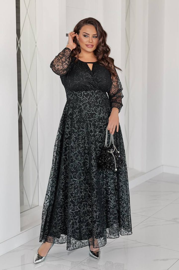 Długa suknia z tiulu i lśniącego floku – stylowa i niezapomniana propozycja na wyjątkowe okazje. Prześwitujące rękawy dodają lekkości, a wyjątkowy dekolt podkreśla elegancję sylwetki. Materiał łączy w sobie wygodę i elegancję, dzięki czemu sukienka ta będzie wyróżniać się na każdą okazję.