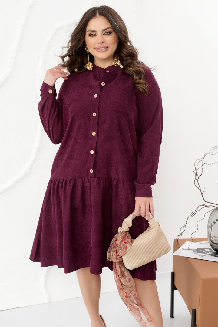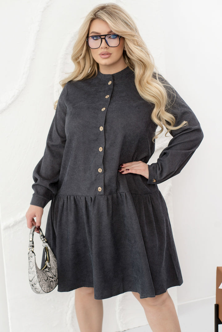Wykonana z miękkiego aksamitu, ta kobieca sukienka doda Ci szyku, nowoczesności i elegancji. Posiada stójkę, długie rękawy z mankietami i zwiewną, wesołą falbankę. Sukienka zapinana jest na rząd guzików z przodu.