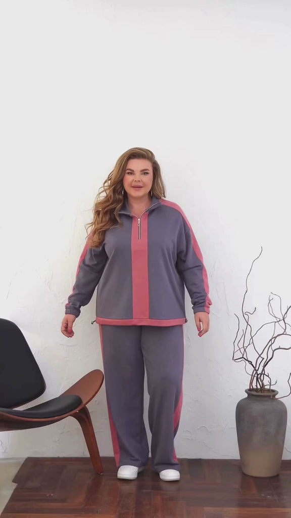 Ten stylowy zestaw łączy w sobie wygodę i nowoczesny design. Bluza wyróżnia się akcentami, małą stójką i zamkiem błyskawicznym, a obniżone ramiona i ściągacz u dołu zapewniają idealne dopasowanie. Spodnie z szerokimi nogawkami z akcentami, gumką w pasie i bocznymi kieszeniami dopełniają całość, dzięki czemu idealnie nadaje się na co dzień. Modna, praktyczna i wygodna – Twój wybór dla osób ceniących sobie swobodny styl!