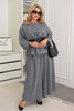 Zestaw składa się z dwóch elementów – luźnej tuniki o prostym kroju z rękawami 3/4, uzupełnionej czarnym paskiem z szeroką klamrą podkreślającym talię. Szerokie spodnie typu kuloty z wysokim stanem tworzą efekt spódnicy. Cały strój prezentuje się elegancko i nowocześnie, a jednocześnie jest wygodny i uniwersalny – idealny na spacery lub stylowe wyjścia do miasta.