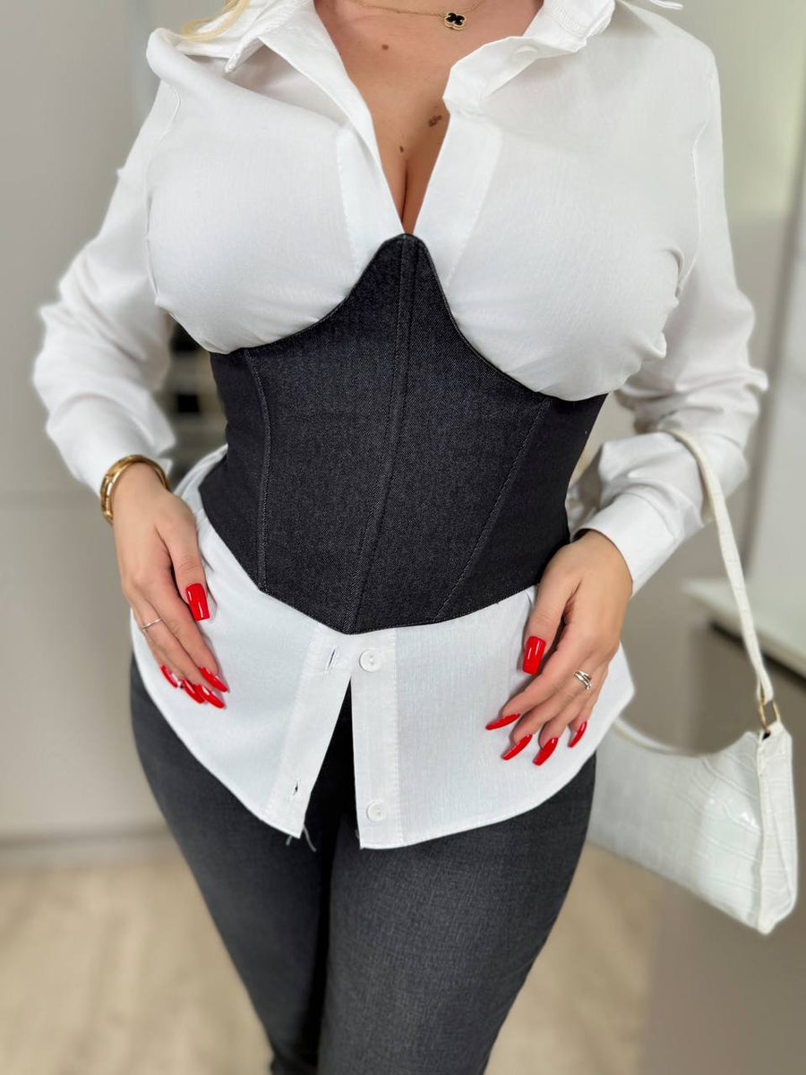 A modern denim corset with lacing at the back, offering a sophisticated yet sexy look. The laces allow for adjustable fitting, accentuating the waist while combining style and comfort. Perfect for creating a bold and elegant appearance.