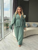 Set with a high waist and a comfortable elastic belt. The trousers have a length of 77/110 cm. The blazer features a wrap design and is fastened with a fabric belt. The sleeves are wide at the bottom and include removable ties that allow the shape to be adjusted. Blazer length – 73 cm, sleeve length from shoulder – 64 cm.