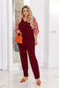 Set with chiffon sleeves, consisting of a blouse and pants. The blouse has a straight silhouette and raglan sleeves made of transparent woven fabric with a print that contrasts with the main fabric. The sleeves end with elastic, and the neckline is V-shaped. There are small slits in the side seams. The pants have a high waist, pockets, and a slightly tapered fit.