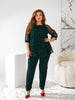 Set de damă format din pantaloni și bluză. Bluza are o siluetă lejeră, cu o cusătură centrală la spate și mâneci raglan cu manșete atașate la tiv. Pantalonii sunt clasici, ușor conici la gleznă, cu talie elastică pentru confort. O alegere excelentă pentru femeia modernă.