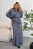 Sproščena bluza z dolgimi rokavi in ​​asimetričnim krojem, z zavezovanjem s tankim pasom za poudarjanje pasu. V kombinaciji s satenastim midi krilom s sproščeno silhueto ustvarja eleganten in ženstven videz, popoln za posebne priložnosti ali večerne izhode.