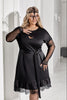 Osupljiva trapezoidna obleka iz goste pletenine, ki je mehka in udobna na telesu. Dolgi rokavi iz elastične mrežice s kristalnimi poudarki in izrez v obliki srca, okrašen z nežnimi kamni, dodajo ženstvenost in sodoben slog. Z A-krojem, čipkastim naborkom na robu in pasom obleka ustvarja eleganten večplasten učinek – popolna za večerne dogodke, praznovanja ali posebne priložnosti.